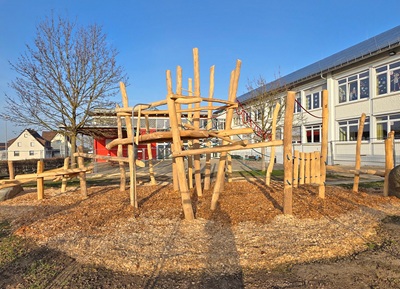 Foto (Stadt Uhingen): Das bisherige Klettergerüst bei der Grundschule Sparwiesen wurde dank eines Zuschusses vom Land durch eine neue Spiel- und Kletter-Anlage ausgetauscht.
