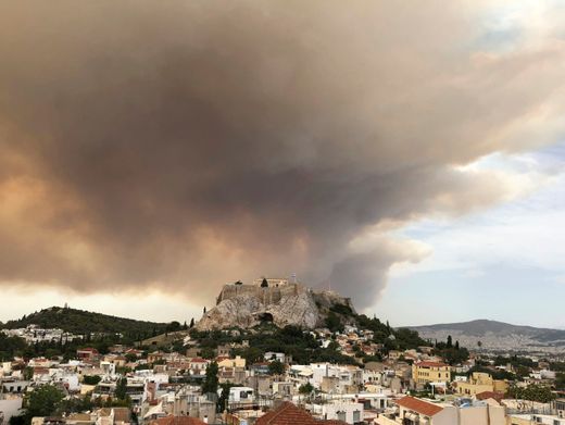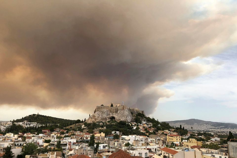 Eine durch einen Waldbrand enstandene Rauchwolke färbt Teile des Himmels über der Akropolis orange